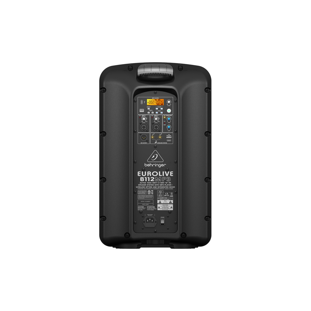 EUROLIVE B112MP3 - профессиональная активная акустическая система предназначена стать легендой рядом с другими EUROLIVE моделями. Одной из лучших характеристик является встроенный МР3 плеер. - Мощная двухполосная акустическая система для живого применения и воспроизведения - Ультракомпактная и легковесная система предоставляет превосходный звук даже при чрезмерном уровне звукового давления - Включен МР3 плеер для проигрывания аудиофайлов через USB - Готовность приёма беспроводных систем - 2-канальный микшер с Mic/Line входами, управлением громкости и светодиодами - 2-полосный эквалайзер плюс встроенный звуковой процессор - Технология Class-D усилителя - Мощный 12'' динамик обеспечивает невероятно глубокий бас и акустическую силу - 1,35'' динамик с алюминиевой диафрагмой для необыкновенно высоких частот - Дополнительный Line выход позволяет подключать дополнительные акустические системы - Трапециевидный дизайн позволяет по-разному размещать систему