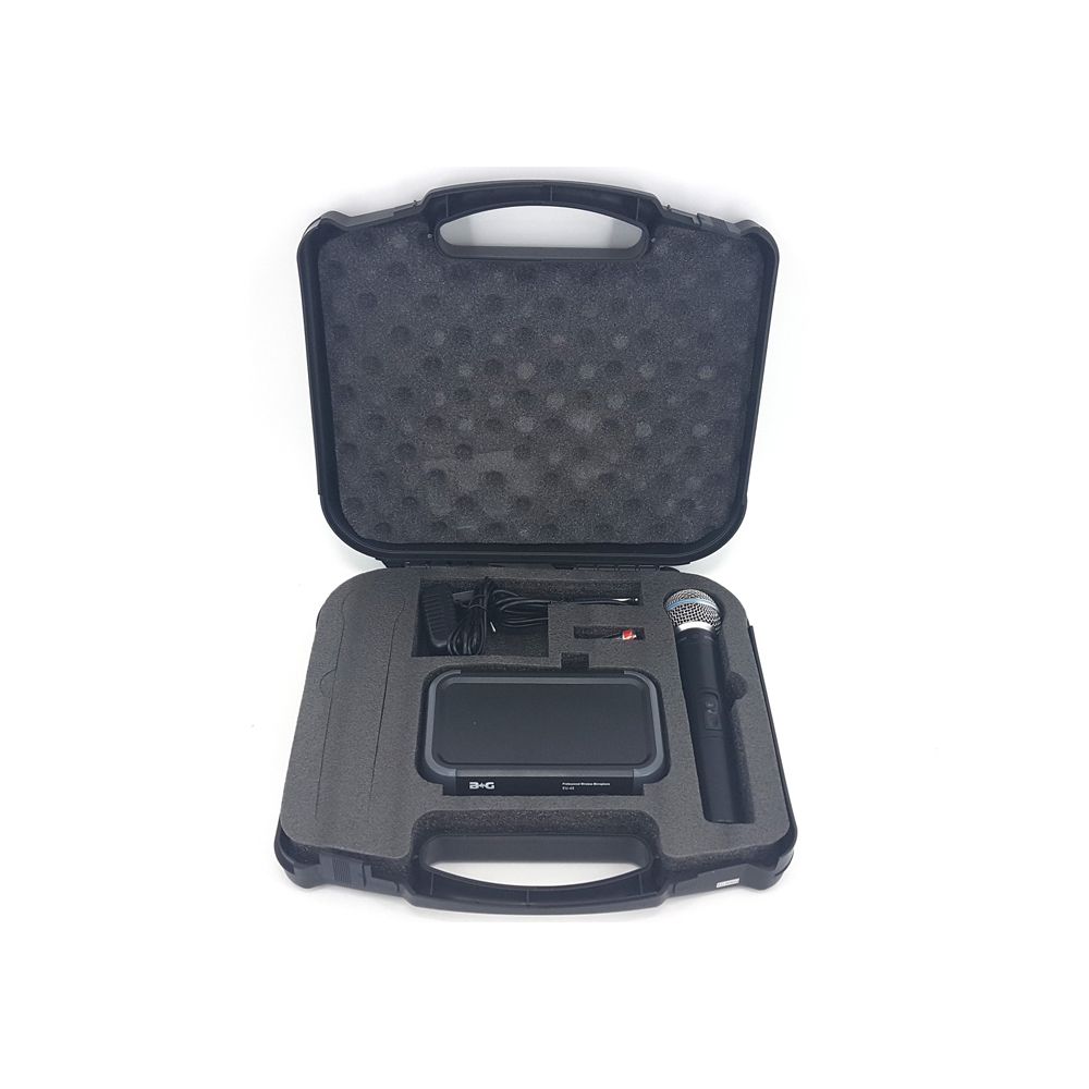 BG EU-45B представляет собой качественную вокальную радиосистему, которая работает в широком звуковом диапазоне. Модель можно использовать как на открытых площадках, так и на закрытых мероприятиях.   Комплектация: 1. Приемник 2. Ручной микрофон Приемник: – индикатор переключателя ON/OFF – регулятор громкости – RF-индикатор – переключатель ON/OFF – антенна приемника – разъем кабеля питания – балансный выходной разъем – выходной аудиоразъем – регулятор шумоподавителя Микрофон: – капсюль – индикатор низкого заряда – переключатель питания – отсек для элементов питания