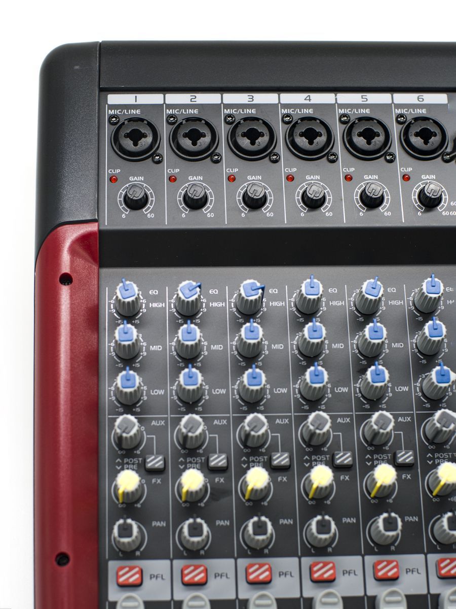 BG T102-FX представляет собой компактный 12-канальный микшерный пульт, предназначенный для профессиональных аудиоприложений. B&G – это качественное и доступное по цене профессиональное звуковое и трансляционное оборудование. Продукция бренда B&G станет идеальным вариантом для баров, ресторанов и конференц-залов. Строжайший контроль технологического процесса обеспечивает высококачественное звучание и безупречную надежность оборудования. Особенности модели: – 12 каналов – LR основной микс – 2 Aux отправления – запись – 2 группы входа стереоканала – 60-миллиметровые пыленепроницаемые фейдеры – 2-трековый мониторинг и воспроизведение в LR – наушники и выходы локального монитора – выделенные стерео, высоковольтные мониторы – сбалансированные XLR-выходы с возможностью привода + 26 дБн – сверхмалошумящий микшерный усилитель – 7-полосный графический эквалайзер – 16-режимный процессор с регулируемыми параметрами DSP – металлические гнезда, позолоченные XLR, герметичные потенциометры и переключатели – встроенный источник питания SMPS