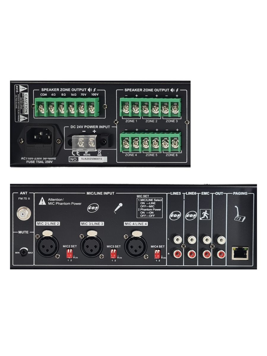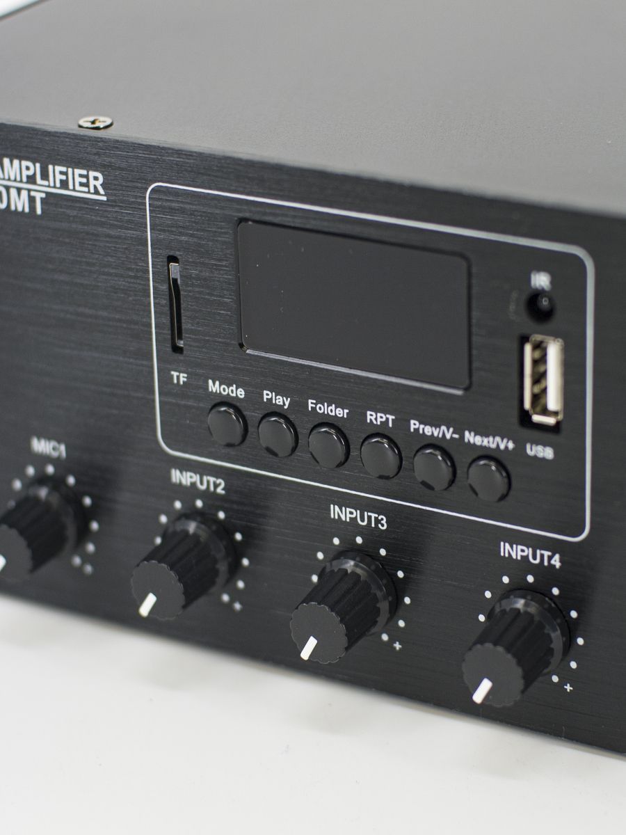 CMX Audio является лидером по производству трансляционного оборудования в Китае. Ассортимент товаров CMX Audio, который мы хотим вам представить, включает микшеры усилители, громкоговорители настенные и потолочные, а также всепогодные звуковые колонны и громкоговорители. Для создания совершенных продуктов компания CMX Audio использует сырье, прошедшее строгий 6-ступенчатый контроль качества QC и QA. Эта система контроля качества соответствует стандартам ISO9001 и ISO14001. Большая часть продуктов CMX Audio соответствует сертификатам CE, RoHS, CB, EN54-16, C-tick, FCC либо UL, и EN54-24. Процесс создания товаров CMX Audio сопровождается высокой целью – быть экспертами в производстве трансляционного оборудования и предвосхищать ожидание клиента. Микшер усилитель 500 Вт, Mp3, SD, USB, BT, FM тюнер, 4 Mic, 3 Aux, 70V/100V/4-16ohm, 6 зон аттенюатор.