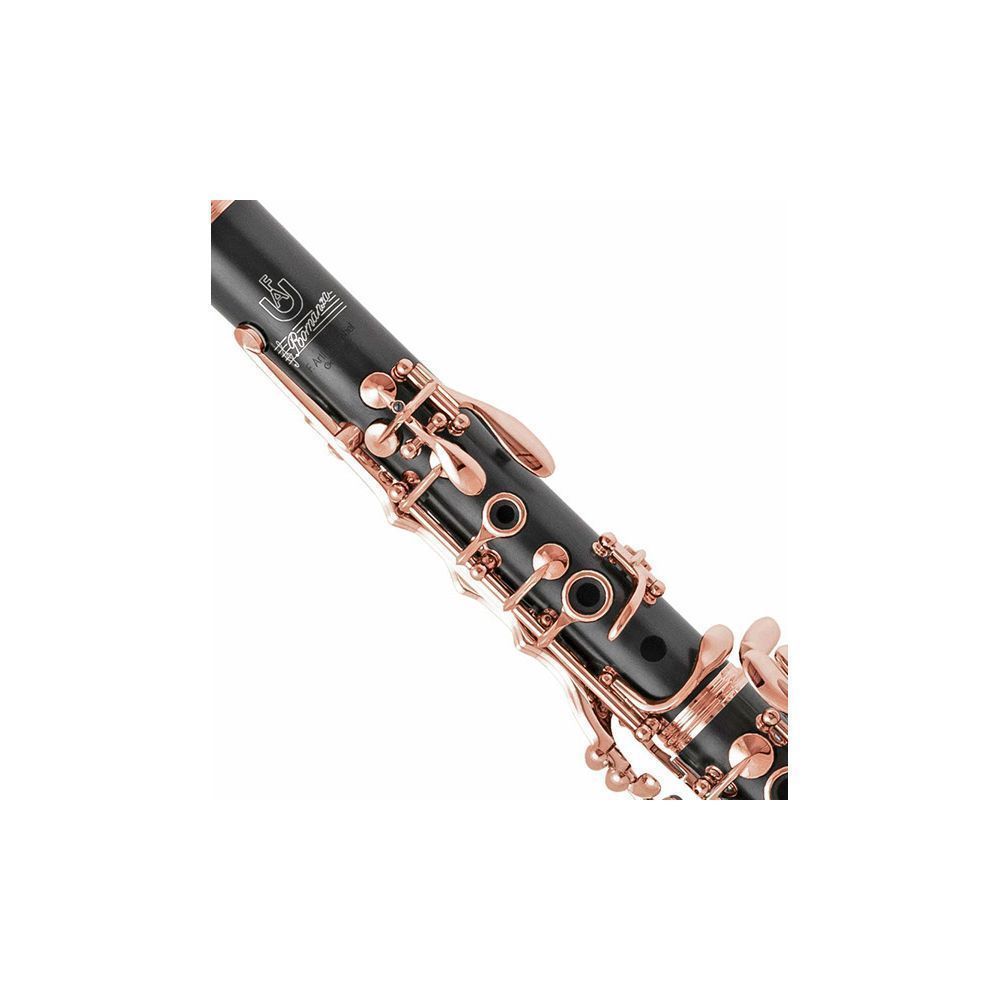 Uebel 426076 Кларнет ROMANZA GRGP, строй A, 18 клапанов, 6 колец, отборное гренадильное дерево, эргономичный дизайн, мензура “Romanza”, рычаг Eb, 4 бочонка, регулируемый упор с кольцом для большого пальца, кожаные подушки LP Gore®, позолоченная (розовое золото) механика, трость Vandoren, кожаный кейс, кожаный чехол для кейса, кожаный футляр для аксессуаров